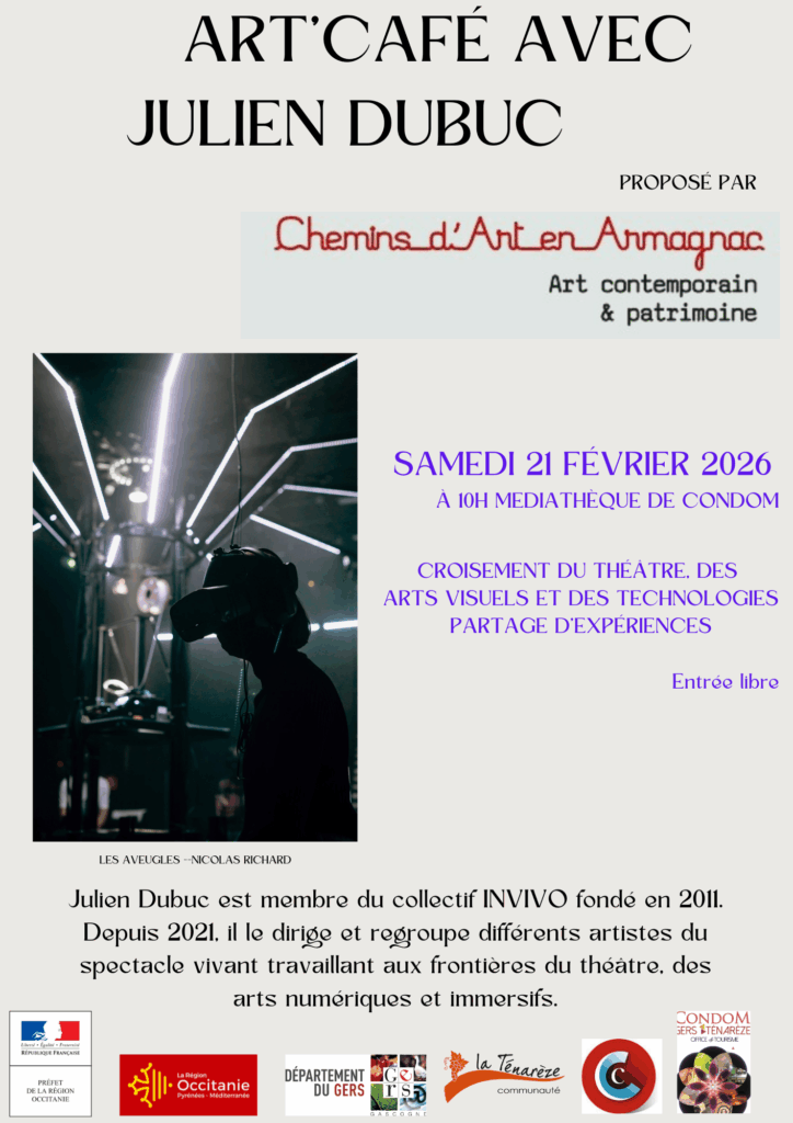 Art’Café #10 – Expériences partagées autour de l’art numérique présentées par Julien Dubuc à la Médiathèque de Condom Julien Dubuc est un artiste plasticien, membre du collectif INVIVO https://collectifinvivo.com/ Les membres du collectif INVIVO se sont rencontrés sur les bancs de l’école. À l’ENSATT (l’École Nationale Supérieure des Arts et Techniques du Théâtre) pour être plus […]